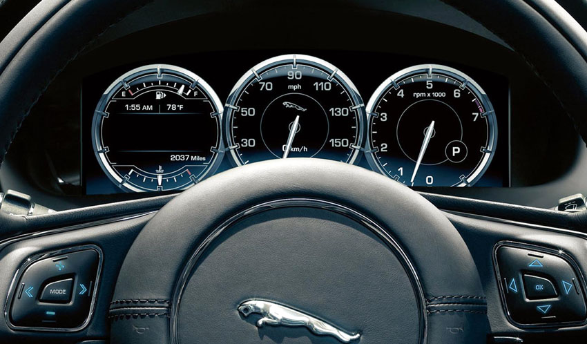 Noul Jaguar XJ are o particularitate interesanta. Bordul sau nu contine fizic niciun „ceas” indicator. Turometrul si vitezometrul exista doar virtual, fiind foarte fidel desenate pe un ecran de foarte inalta rezolutie, cu diagonala de 12,3 inch. Cadranele exista, au forma clasica rotunda si sunt parcurse de „limbi” indicatoare, aidoma celor clasice. Dupa ce porniti masina, trei cadrane rotunde apar in fata ochilor soferului, unul central pentru viteza, unul in dreapta pentru masurarea turatiei motorului si unul in stanga pentru afisarea informatiilor depre tempeatura si nivelul de carburant.